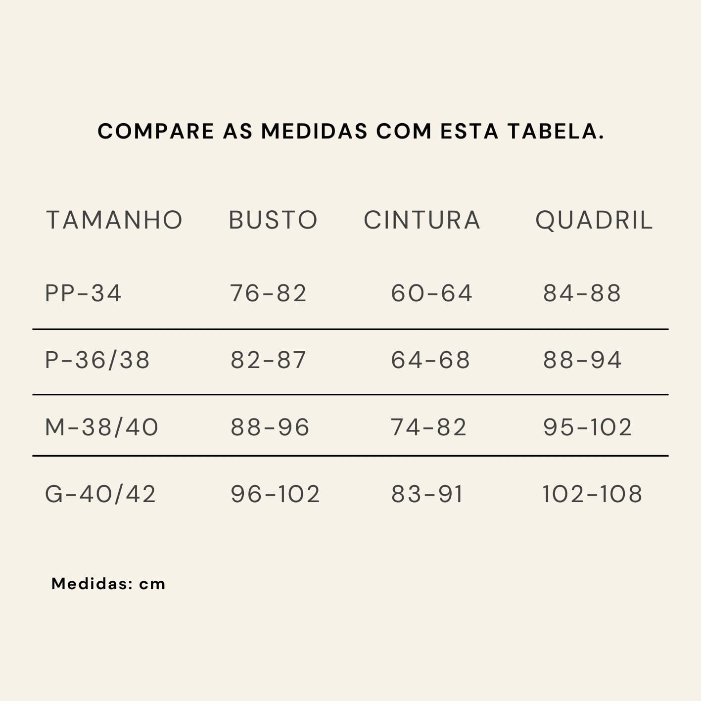 Modelagem ajustada ao corpo, com elasticidade e sustentação. Confira a tabela abaixo e tenha como base o tamanho. Caso tenha uma fita, use as medidas complementares.